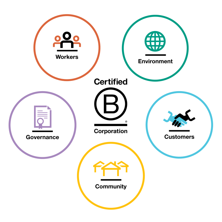 In order to meet all of these requirements, a B Corp must prove that they’re dedicated to continuous improvement and awareness of these core impact areas – Workers, Environment, Customers, Community and Governance.