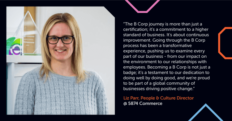 Here at 5874, we believe that business should be a force for good, which is why we decided to undergo the rigorous B Corp certification process. Achieving this certification was definitely a team effort, and is something that we couldn’t have completed without the sheer hard work and diligence from a few key members of the team. One of the people that was crucial throughout this process was Liz Parr, People & Culture director at 5874. Here’s what Liz had to say about the process and what the certification means to us: